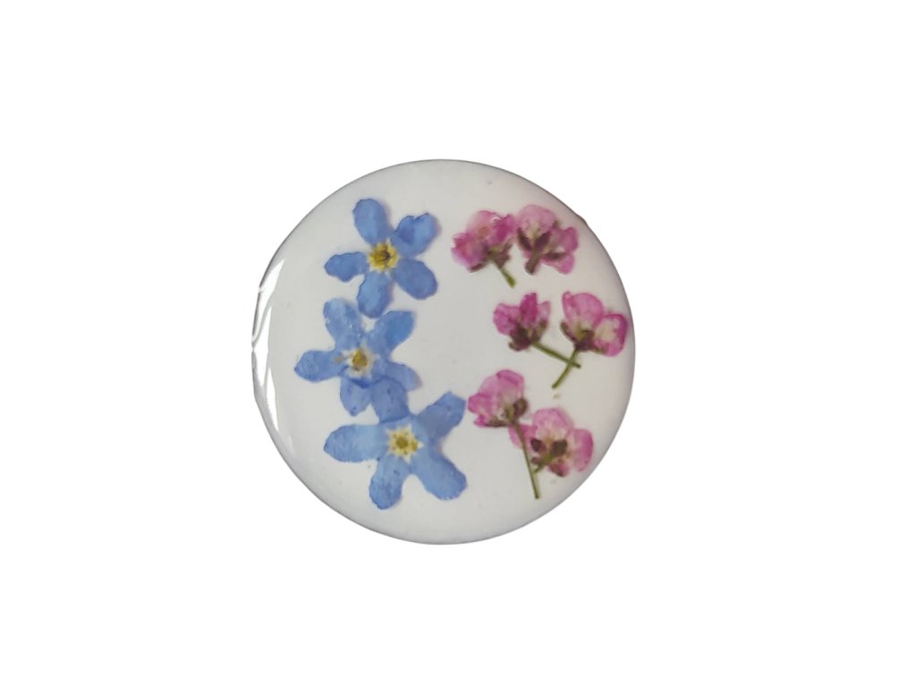 ✨ Unikátní květinová brož s pravými květy pomněnky a lučním kvítím zalitým v křišťálově čiré pryskyřici.