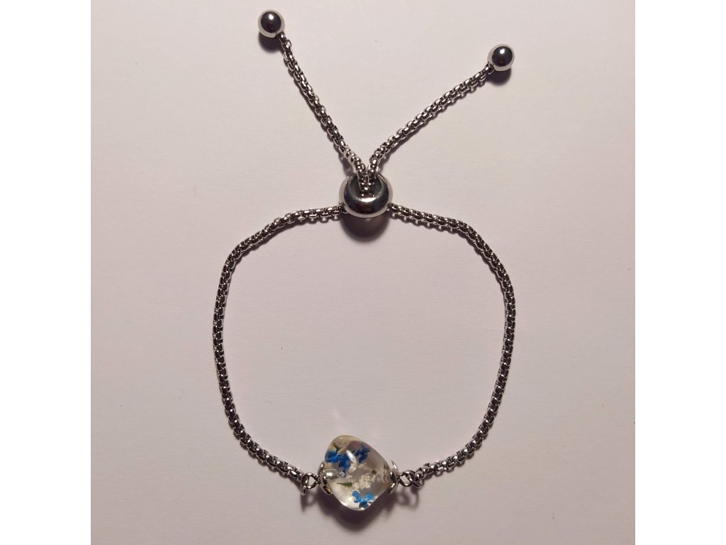 Tento ručně vyráběný náramek spojuje krásu přírodních květin s jemností nerezové oceli. Každý kus je originál – obsahuje skutečné květiny zalité v křišťálové pryskyřici.