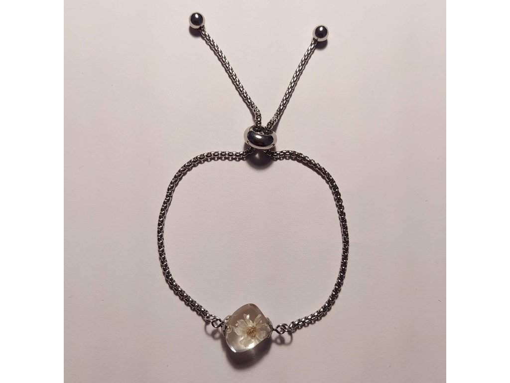 Tento ručně vyráběný náramek spojuje krásu přírodních květin s jemností nerezové oceli. Každý kus je originál – obsahuje skutečné květiny zalité v křišťálové pryskyřici.