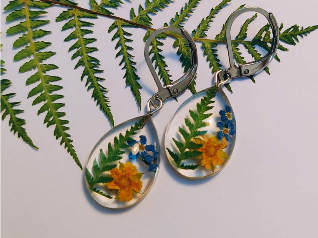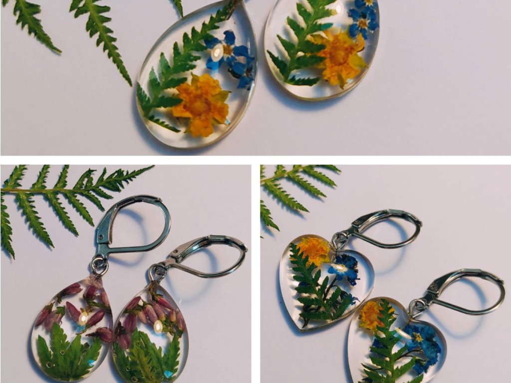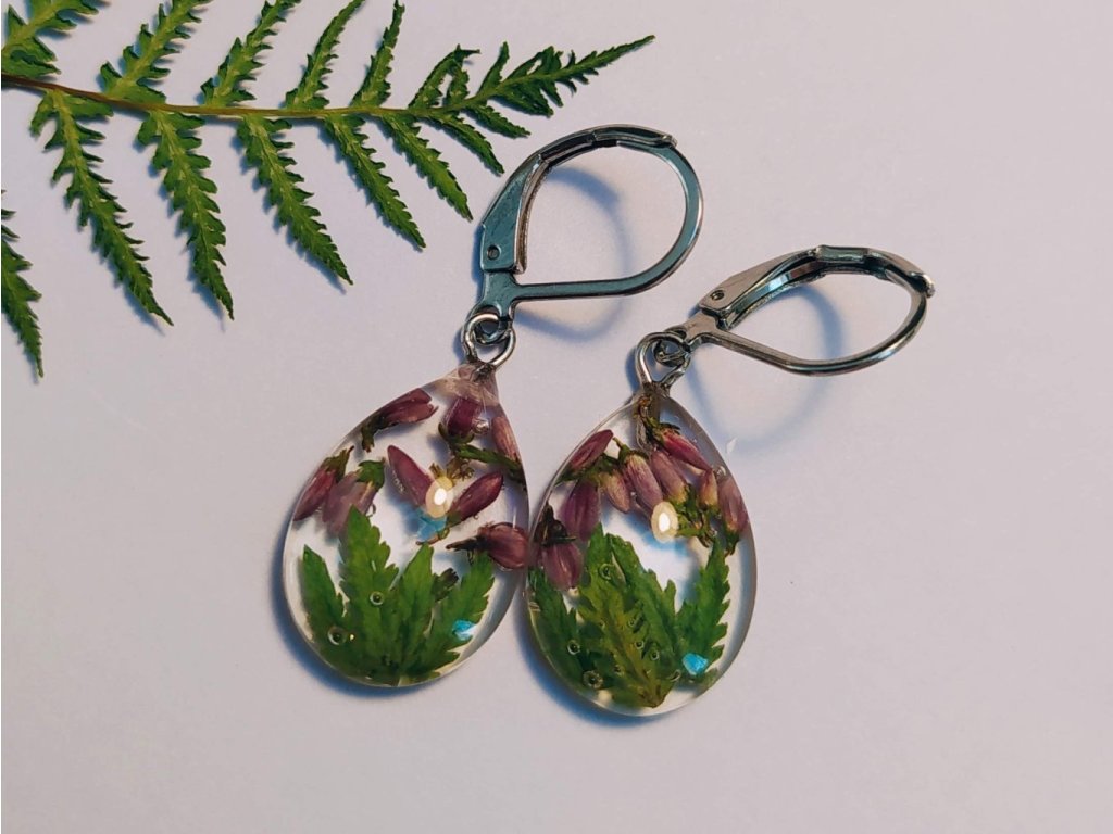 Květinové náušnice kapka, srdce z pryskyřice – s květy pomněnky, pryskyřníku, vřesu a kapradím | Přírodní šperk, originální dárek – jedinečný ručně vyráběný šperk pro milovníky přírody a originality.