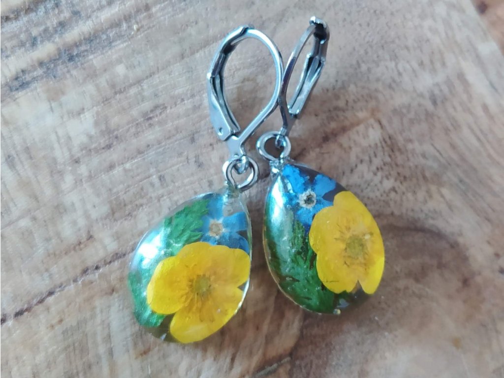 Přírodní květy pomněnky a květy pryskyřníku a květy vřesu a kapradí jsou pečlivě vybírány a zalévány do kvalitního materiálu, což jim dodává dlouhou životnost a jedinečný vzhled. Každý pár náušnic je ručně vyráběný, a proto se může jemně lišit od fotografie.