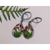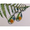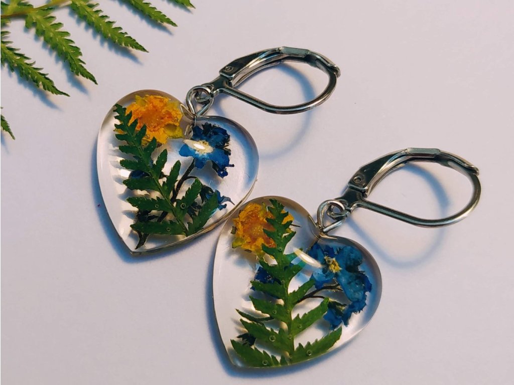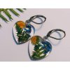 Květinové náušnice kapka, srdce z pryskyřice – s květy pomněnky, pryskyřníku, vřesu a kapradím