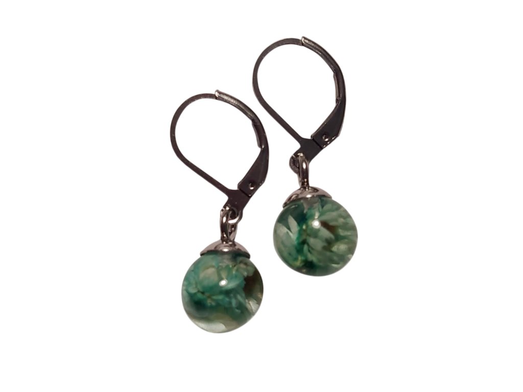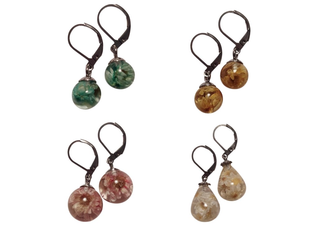 Květinové náušnice kapka z pryskyřice – s květy glixie | Přírodní šperk, originální dárek – ručně vyráběný originální šperk s květy glixie pro milovníky přírody a jedinečných doplňků.