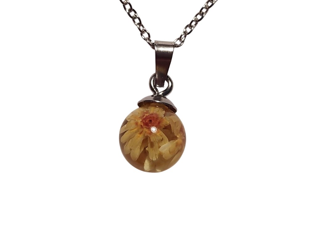 Elegantní květinový přívěsek z pryskyřice s pravým květem žluté glixie. Ručně vyráběný šperk inspirovaný krásou přírody. Každý kus je originál.