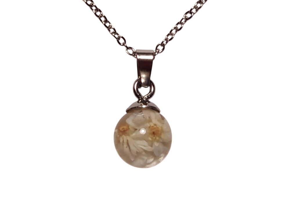 Přívěsek je vyroben z křišťálové pryskyřice, která krásně uchovává přirozený vzhled květin.