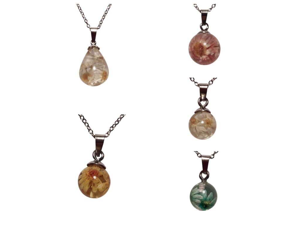 Přírodní květiny jsou pečlivě vybírány a zalévány do kvalitní šperkařské křišťálové pryskyřice, což jim dodává dlouhou životnost a jedinečný vzhled. Každý šperk je ručně vyráběný, takže se může mírně lišit od fotografie.